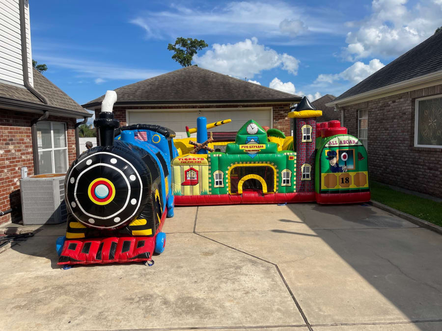 The train is at the station with this adorable and colorful Fun Express train station inflatable obstacle course. Once kids enter through the front of the train, it's on to gentle climbs and whizzing slides, under upside-down obstacles, and maneuvering around pop ups. Once in the interior of the station, participants are greeted by a 3D palm tree and a train signal pole.