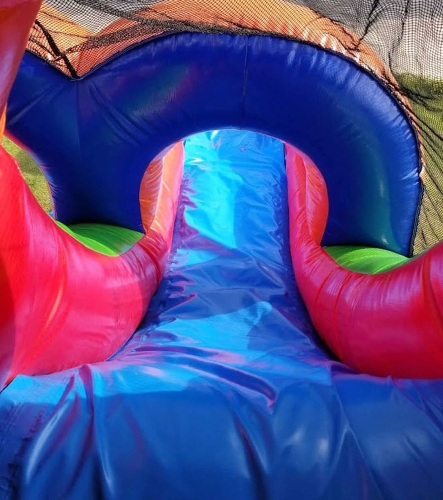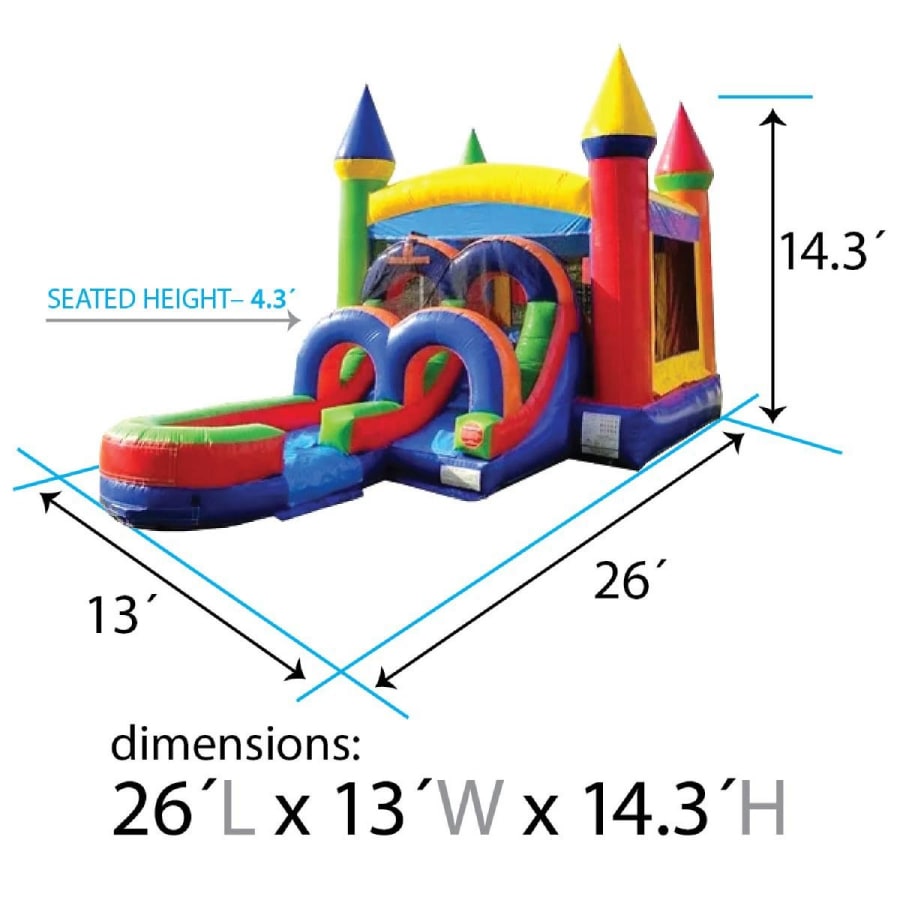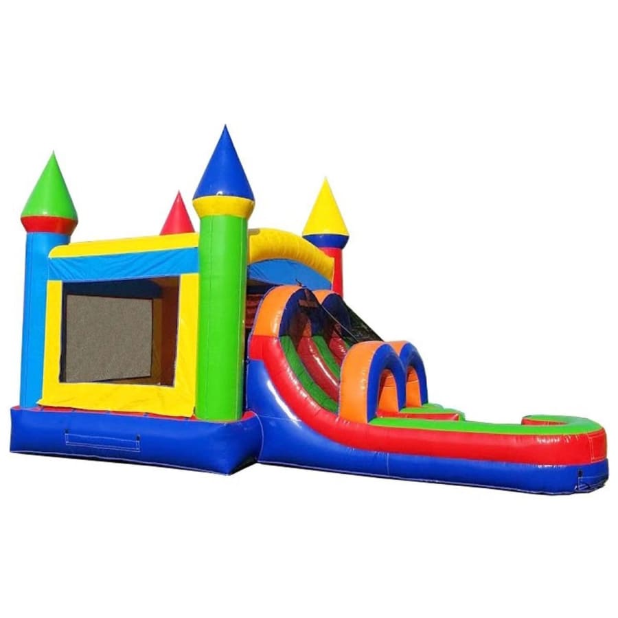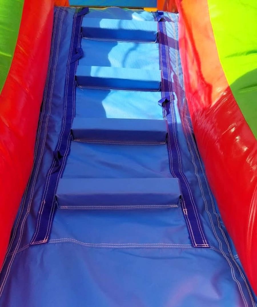 This Slide Bounce House Combo is a wonderful and welcome addition to all children's parties and events. Featuring bright, vibrant, gender-neutral colors in our very popular rainbow theme, this unit can be used for a boys or girls event. Kids can step inside the spacious bouncing area and jump to their heart's delight, then climb up the interior rock wall and head down the slide.