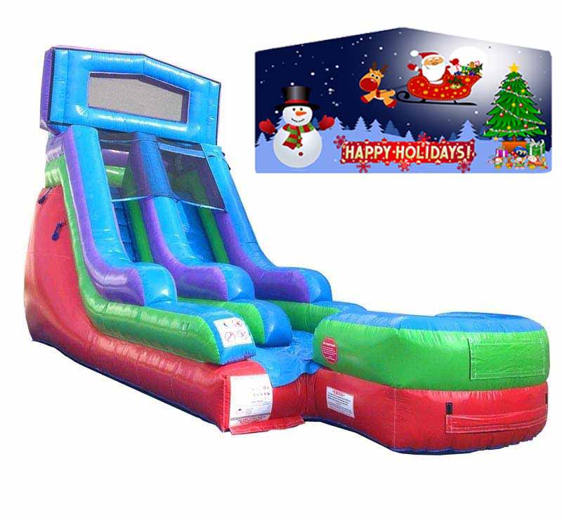 Happy Holiday 15' Modular Retro Rainbow Inflatable Water Slide. This 15' tall inflatable Waterslide is a real crowd pleaser, providing refreshing fun and thrills to kids of all ages (and maybe a few adults, too). Slide was designed with children's safety at heart, featuring an inflated landing zone with built-in drains that keeps the water level low enough for a good time, but safe enough for kids of all ages. Note: This slide can be used Wet/Dry