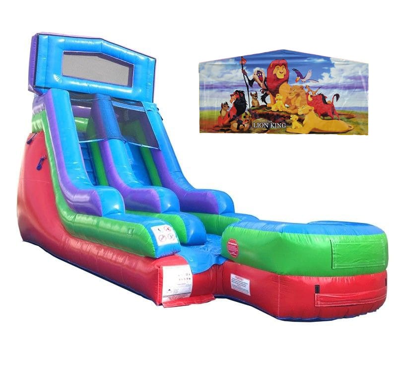 Lion King 15' Modular Retro Rainbow Inflatable Water Slide. This 15' tall inflatable Waterslide is a real crowd pleaser, providing refreshing fun and thrills to kids of all ages (and maybe a few adults, too). Slide was designed with children's safety at heart, featuring an inflated landing zone with built-in drains that keeps the water level low enough for a good time, but safe enough for kids of all ages. Note: This slide can be used Wet or Dry
