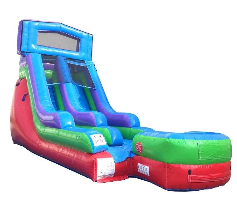 Summertime Fun with the 15' Modular Retro Rainbow Inflatable Water Slide. This 15' tall inflatable Waterslide is a real crowd pleaser, providing refreshing fun and thrills to kids of all ages (and maybe a few adults, too). Slide was designed with children's safety at heart, featuring an inflated landing zone with built-in drains that keeps the water level low enough for a good time, but safe enough for kids of all ages.