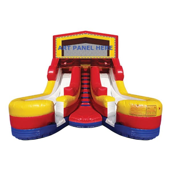 Double the Fun, Double the Excitement, Double the Splash! The definition of cool ! This Slide is Awesome with a capital A!!!!! Head through the Spike Entrance, Climb the stairs, choose left or right and race your friends to the bottom for some Serious Splash FUN – Repeat. Note: Slide can be used Wet or Dry Inflated Dimensions 20' x 18' x 17'